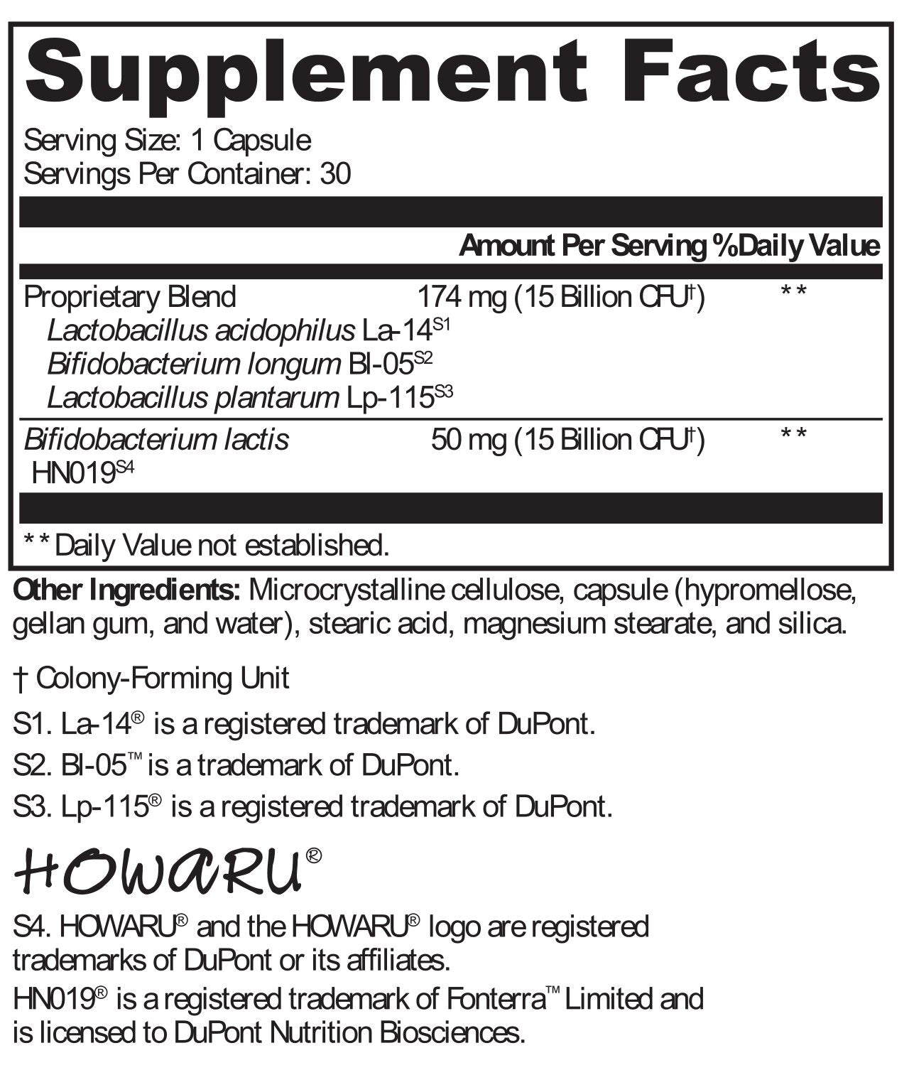 Probio Daily is a vegetarian, dairy- and gluten-free, four-strain probiotic totaling 100 billion CFU† per capsule. Each vegetarian capsule is sealed in nitrogen-purged aluminum blister packs to serve as protection from factors proven to compromise the stability of probiotics such as heat, moisture, and oxygen. Probio Daily provides four researched strains of beneficial bacteria, including the extensively studied HN019® strain of Bifidobacterium lactis. These live microorganisms have proven health benefits and well-established safety, and have been tested for epithelial cell adhesion and/or resistance to low pH.*