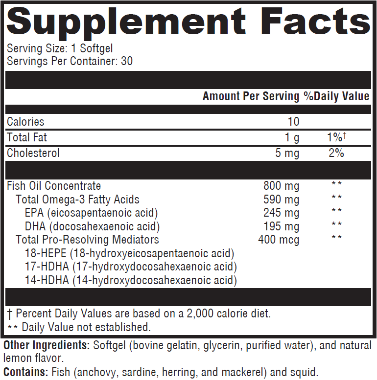 OmegaPure PRM features highly concentrated fish oil with a standardized quantity of the pro-resolving mediators (PRMs) 18-HEPE, 17-HDHA, and 14-HDHA. Metabolites of PRMs, known as specialized PRMs, provide building blocks to support the natural resolution of the immune response.*